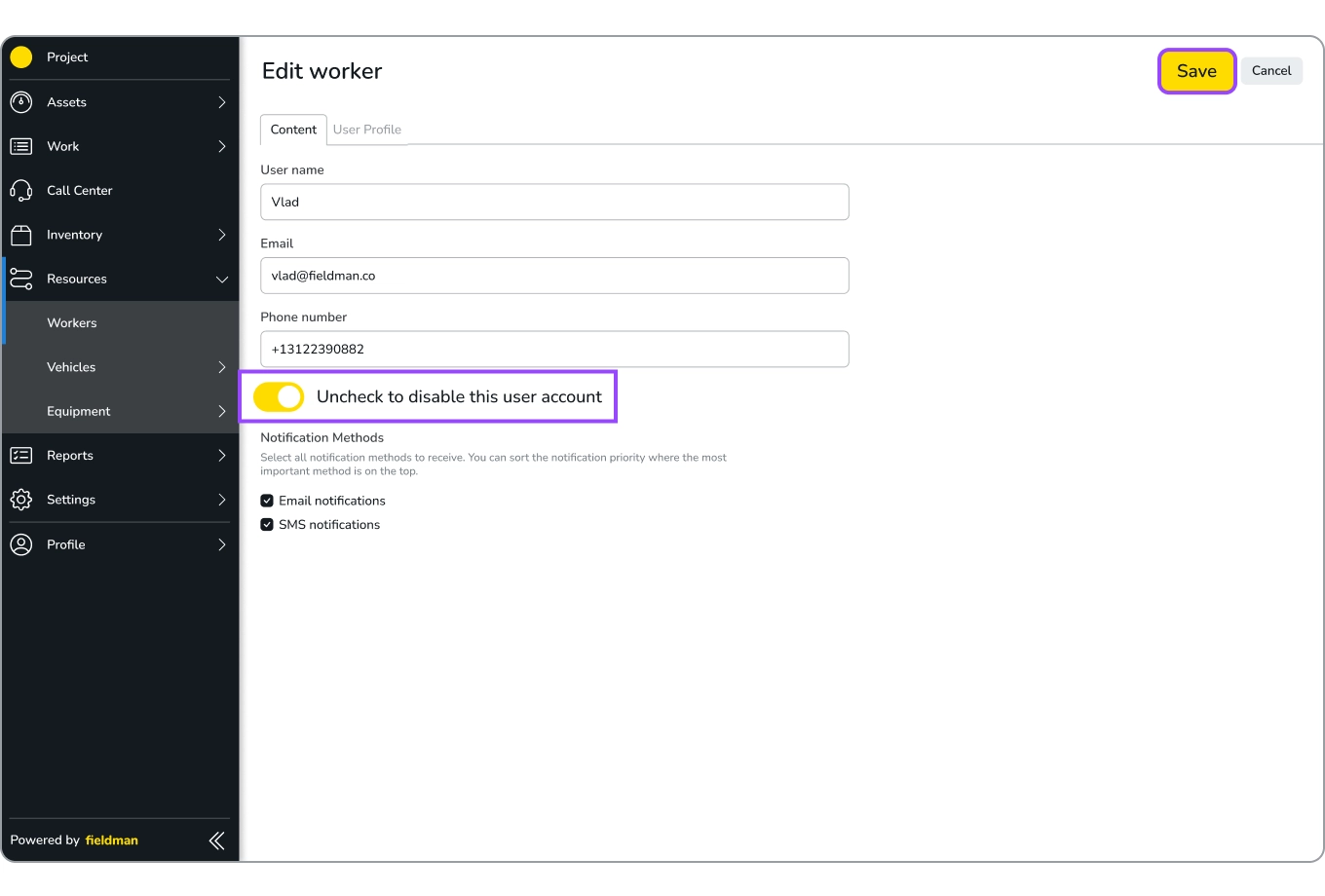 - To disable the worker’s access, toggle off the Is Enabled control. Click Save at the top right of the screen.