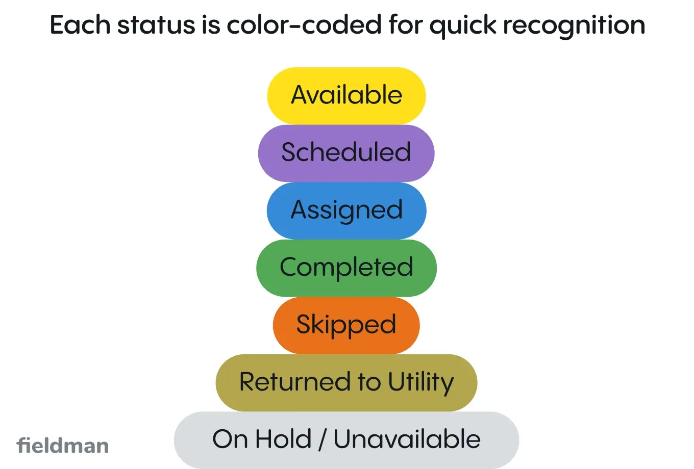 Copy link👉 Each status is color-coded in the Fieldman platform so users can quickly recognize progress at a glance.